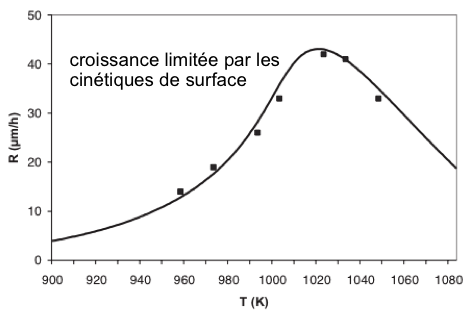 La vitesse de croissance peut être modulée en faisant simplement varier la température et/ou les pressions partielles des précurseurs. Il est alors possible de tirer partie de la grande anisotropie de croissance des cristaux III-(V,N) puisqu'une large plage de vitesse de condensation peut être réglée de 3 à plus de 100 µm/h en fonction de la température et de la composition de la phase gazeuse, pour chaque face des cristaux :